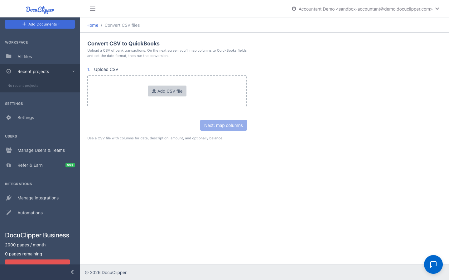 Already have transactions in a CSV? Import them into DocuClipper to convert and re-export in any supported format.
