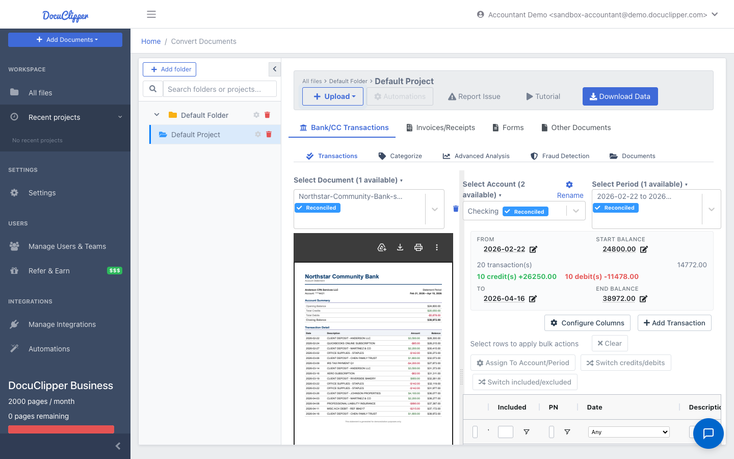 DocuClipper extracts structured data from brokerage and investment account statements the same way it handles bank statements. The output includes transaction history, holdings, and account summary figures, which you can download to Excel or CSV.